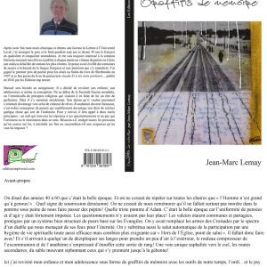 Roman Graffitis de mémoire, publié le 30 novembre 2017. Imprimé au Canada. Numéro d’ISBN : 978-2-9816519-2-1. Contient 174 pages. Format : 9 x 6 po. Cliquez ici pour télécharger l’extrait. *Merci de bien vouloir considérer le temps de téléchargement car il s’agit d’un fichier PDF volumineux.